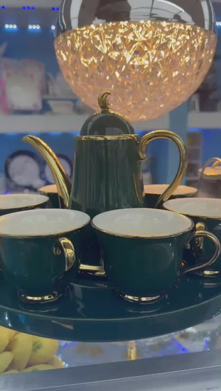 Serve tea in timeless style with this Emerald Gold Porcelain Tea Set. Featuring a deep emerald green finish with elegant gold accents, this set brings a luxurious and sophisticated look to any kitchen or dining table.